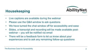 The document outlines the business case for accessibility, emphasizing the importance of inclusive design and the benefits of employing individuals with disabilities. It features contributions from various organizations, including Accenture and Intuit, discussing strategies for improving accessibility and inclusion in the workplace. Overall, it highlights that prioritizing accessibility not only fulfills social responsibility but also enhances business performance and innovation.