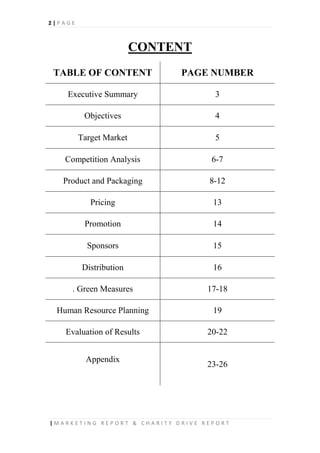 The group organized a charity drive to raise money for an orphanage called Hati Orphan Care. They aimed to raise RM2500 by selling products such as herbal tea, orange juice, and herbal jelly. They analyzed competitors who were also selling drinks and snacks. The group engaged in promotion activities in the weeks leading up to the main charity drive event, such as giving out product samples and explaining their cause to passersby. On the day of the event, they had various products and pricing strategies. Through their efforts, they managed to raise RM1500 in sales and received an additional RM1000 donation, meeting their fundraising goal.