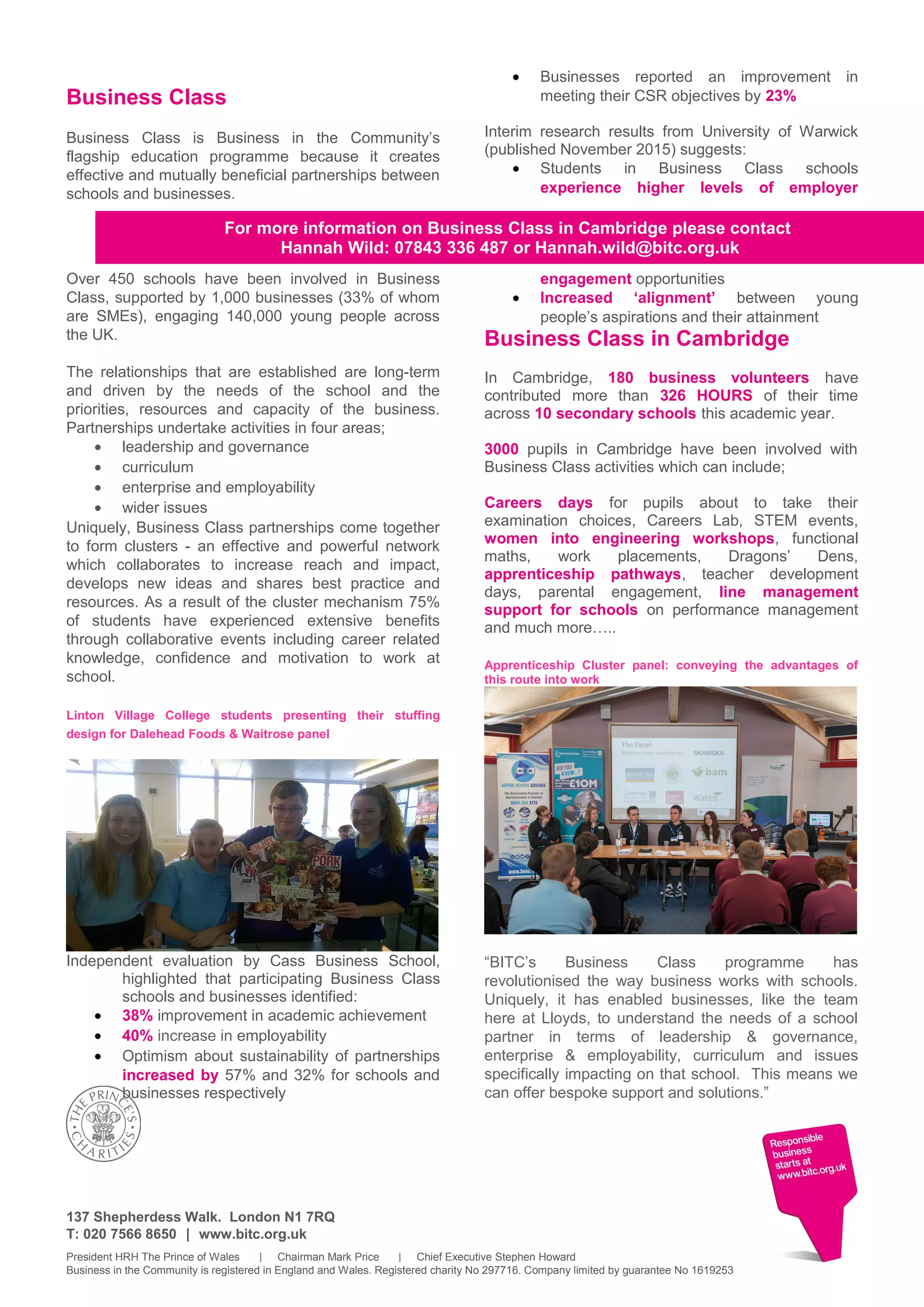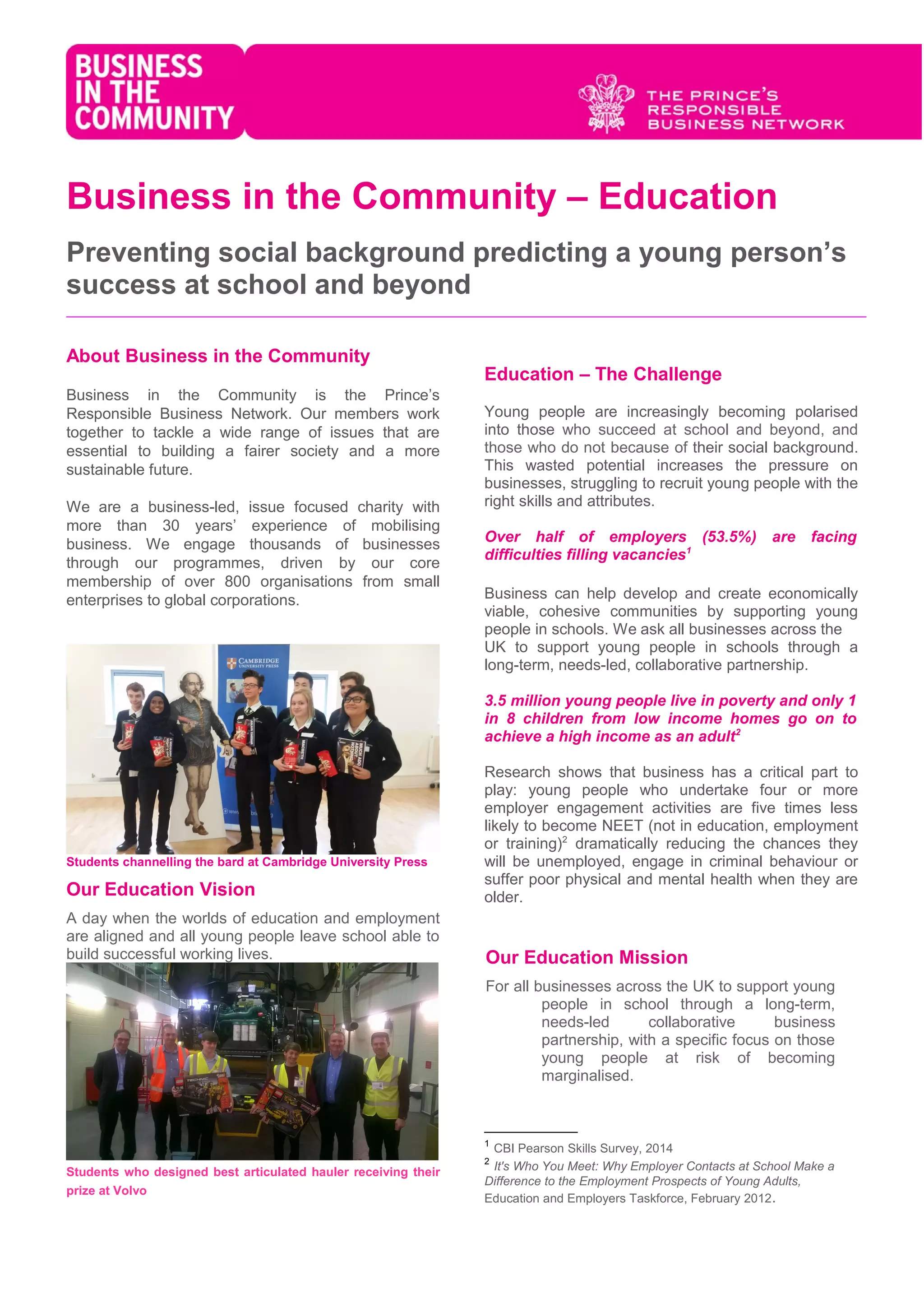 Business in the Community is a charity that mobilizes businesses to tackle social issues. It engages over 800 member organizations through programs like Business Class, its flagship education initiative. Business Class creates partnerships between over 450 schools and 1,000 businesses to improve academic achievement, employability, and sustainability through leadership, curriculum, enterprise, and other activities. Evaluations found improvements like a 38% increase in academic achievement and 40% increase in employability for participating schools.