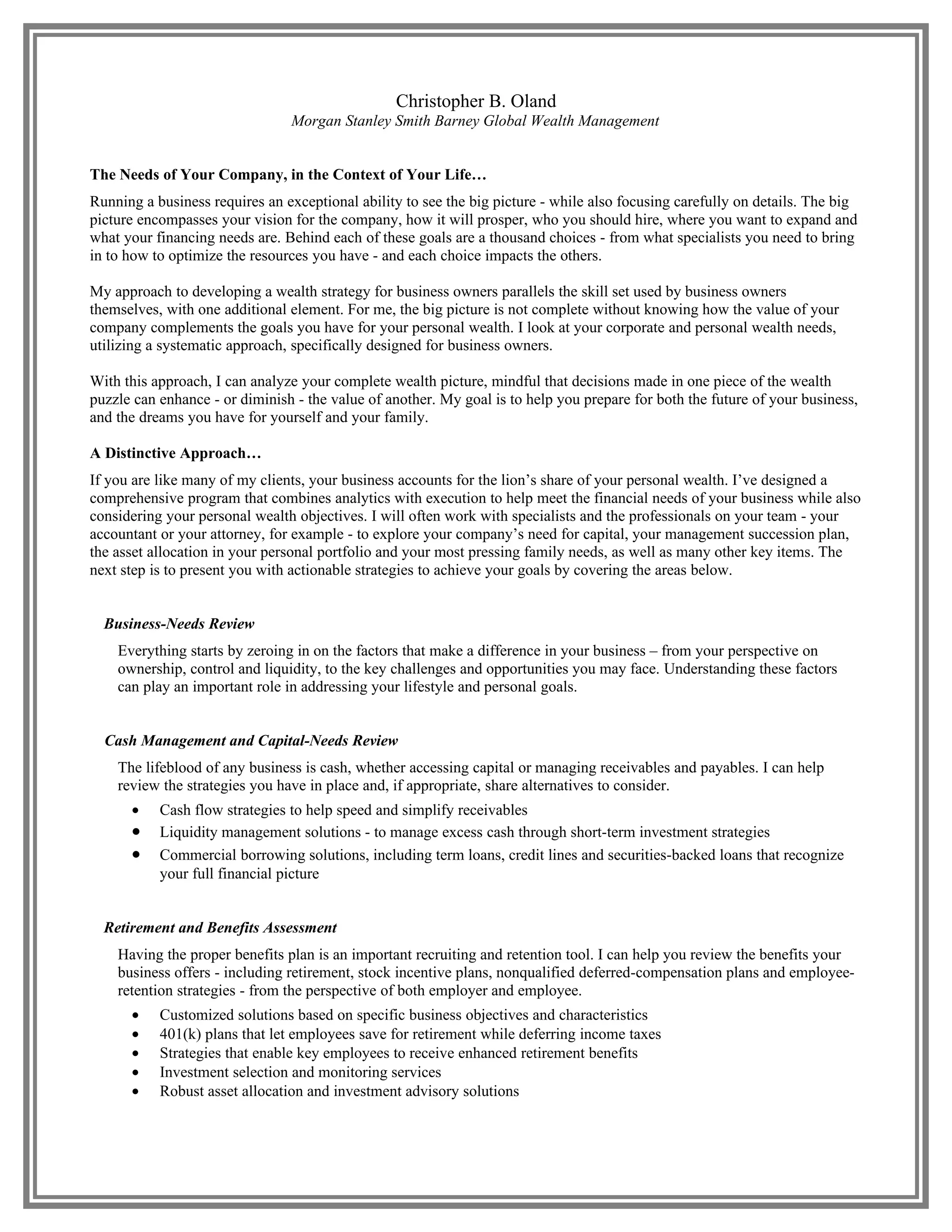 The document discusses Christopher B. Oland's approach to developing wealth strategies for business owners. He analyzes a business owner's complete wealth picture, considering both corporate and personal goals. His distinctive approach involves reviewing business needs, cash management, benefits, risks, succession planning, and developing a family wealth plan to ensure business and personal wealth complement each other. The goal is to help business owners prepare for their company's future as well as their own personal and family dreams.
