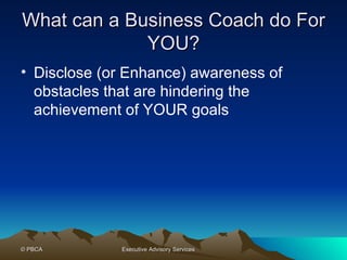 The document discusses what a business coach can do for clients. A business coach can help clients identify obstacles hindering their goals, understand their personality and motivations, gain insights into how to improve their business and personal effectiveness, receive customized training to advance their skills and learning, and temporary accountability through weekly sessions to evaluate progress. The business coach emphasizes the importance of time and effort commitment from clients to achieve results.