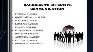 4. It discusses common barriers to effective communication such as physical barriers, language barriers, organizational structure barriers, and emotional attitudes.