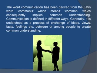 This document discusses formal and informal communication in organizations. Formal communication follows regulated channels and is recorded, including downward communication from superiors to subordinates and upward communication from subordinates to superiors. Informal communication occurs through unofficial grapevines and does not follow authority lines. While informal communication can distort information and lead to rumors, it also provides alternative information flow and emotional relief. The document also provides tips for improving communication effectiveness such as clarifying ideas before communicating and ensuring proper feedback.