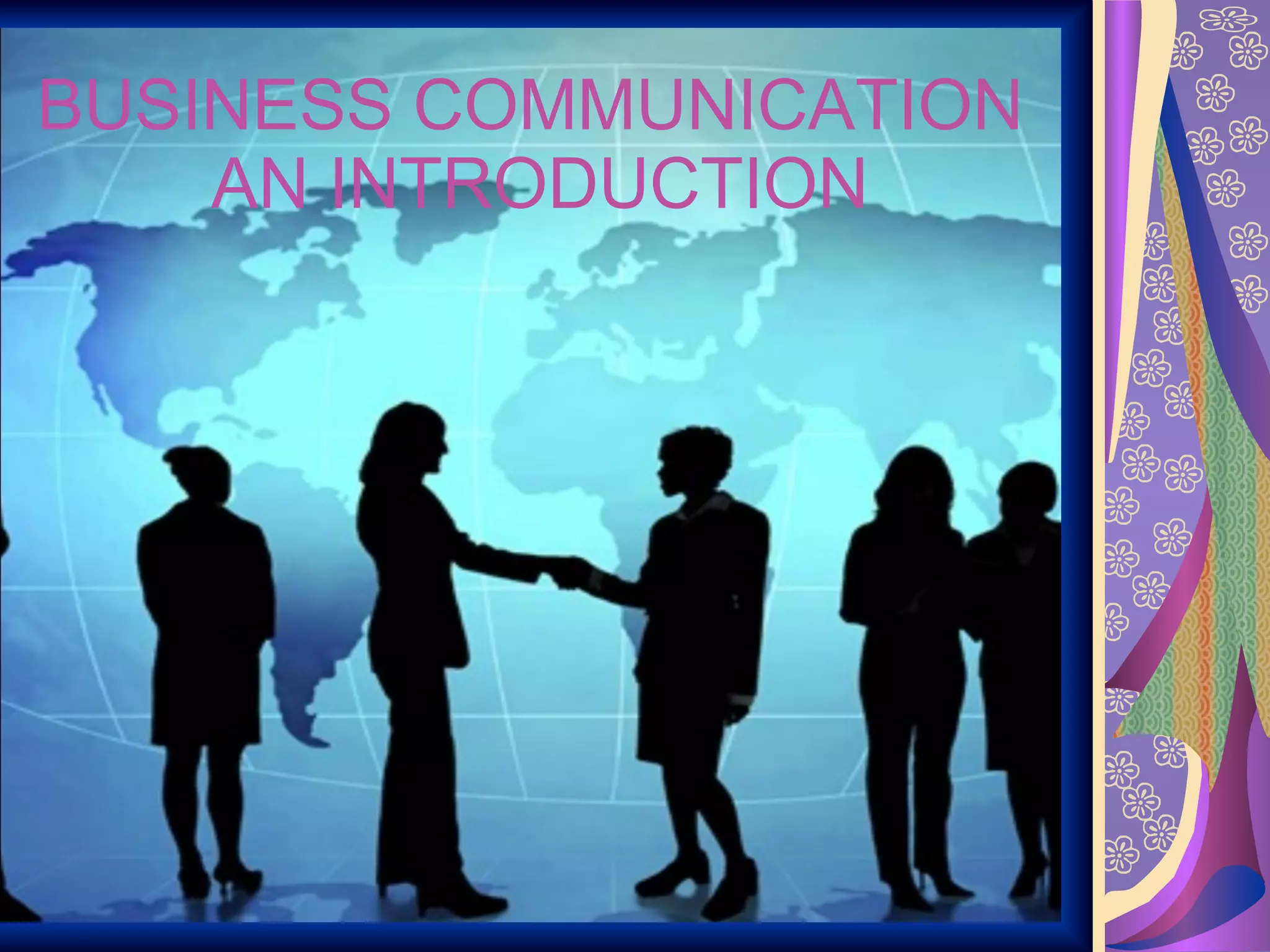 1. The document discusses various aspects of business communication including the communication process, types of communication such as written, oral, and nonverbal, and barriers to effective communication.