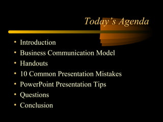 This document provides tips and guidelines for effective business communications and presentations. It discusses the business communication model, common presentation mistakes to avoid, PowerPoint presentation tips, and feedback. The key points are: