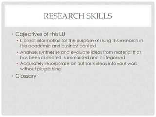 This document discusses research skills for academic and business contexts. It outlines the objectives of collecting, analyzing, synthesizing, and evaluating ideas from sources to incorporate into work accurately without plagiarizing. It also describes the need to determine what information is needed and where to find it, including internal existing resources and external resources to find. The document differentiates between primary research conducted directly and secondary research done by others, providing examples of each type. It provides tips for integrating material and referencing sources properly to avoid plagiarism.