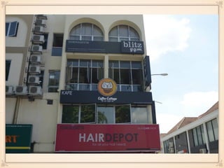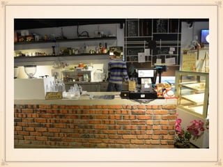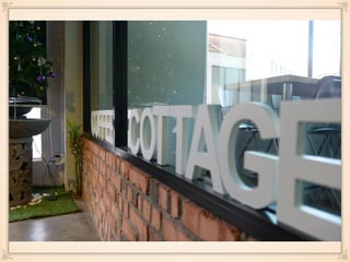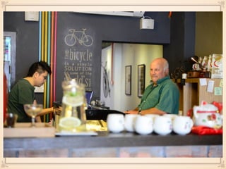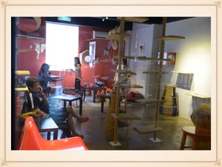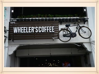 This document contains information about two cafes - Coffee Cottage and Wheeler's Coffee. Coffee Cottage is a cat cafe located in Subang Jaya, owned by 4 businessmen, with a mission to bring a unique culture from overseas. Their target market is youngsters and pet lovers. Wheeler's Coffee is a bicycle-themed cafe located in Georgetown, owned by 2 businessmen, with a mission to promote cycling culture. Both cafes offer various food and drinks and have future plans to renovate and adapt to trends.