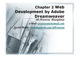 The document discusses preparing to develop websites using Adobe Dreamweaver. It covers setting up a local web server using programs like AppServ or XAMPP, configuring Dreamweaver preferences, connecting Dreamweaver to a MySQL database, retrieving and modifying data using forms, and implementing user authentication and access restrictions. The chapter is presented by Mr. Warawut Khangkhan and focuses on foundational Dreamweaver functionality for web development.