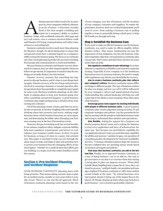The document provides a comprehensive guide to business continuity planning, emphasizing its importance in maintaining operations during unexpected disruptions. It distinguishes between business continuity planning and disaster recovery, recognizing the proactive nature of continuity planning in ensuring minimal business impact. Additionally, it outlines essential steps such as establishing a business case, conducting risk assessments, building response teams, and evaluating external resources to effectively manage potential business interruptions.