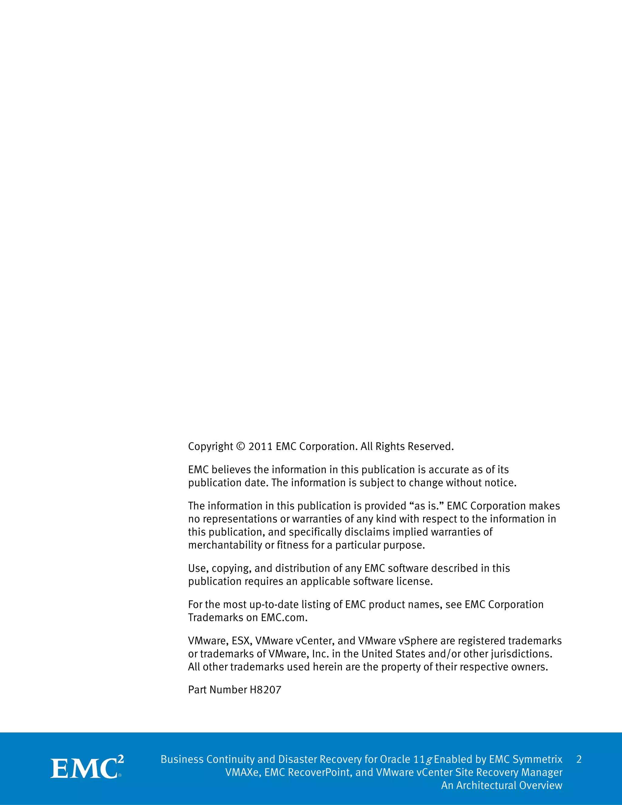 This white paper outlines a data protection and disaster recovery solution for virtualized Oracle Database 11g environments, leveraging EMC Symmetrix VMAXE, EMC RecoverPoint, and VMware vCenter Site Recovery Manager. It details the technology components, architecture, and configuration needed for local data protection, automated failover, and disaster recovery processes, while also emphasizing the benefits such as simplified replication and rapid recovery. The document serves as a guide for Oracle database administrators and IT professionals involved in implementing these solutions.