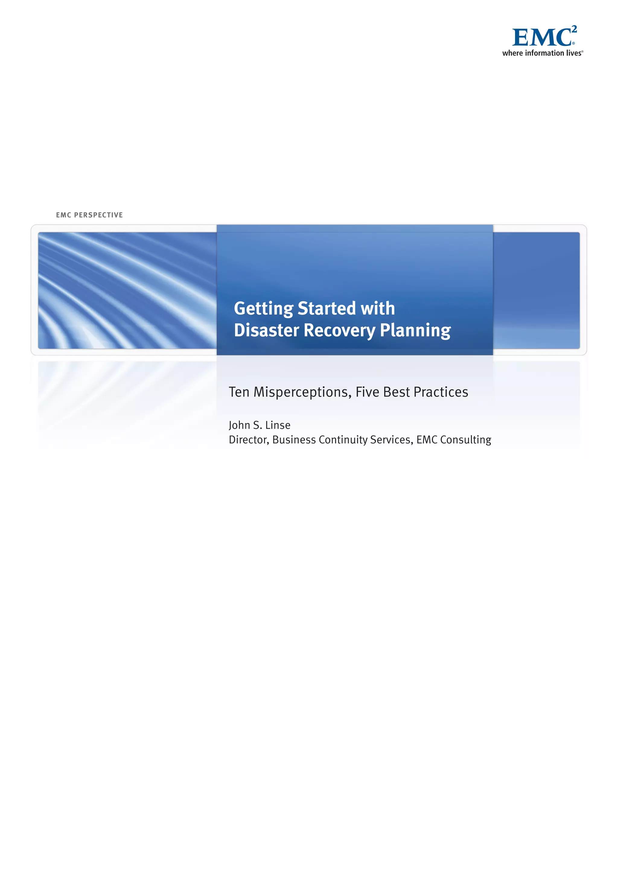 The document discusses disaster recovery planning and provides best practices. It addresses common misperceptions about business continuity/disaster recovery programs. Some misperceptions include that they are too expensive, only involve natural disasters, and that replicating data is sufficient. The document recommends five best practices: developing business justification through impact analysis, matching the recovery approach to needs, setting recovery objectives, developing a data management strategy, and managing the overall recovery program.