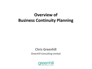 The document provides an overview of business continuity planning (BCP), detailing its purpose of maintaining critical business processes during interruptions or disasters. It outlines the steps involved in BCP, including risk assessments, business impact assessments, and recovery strategies, emphasizing the importance of regular reviews and updates. Key elements include identifying critical processes and assets, establishing recovery time objectives, and ensuring effective communication and resource management during a crisis.
