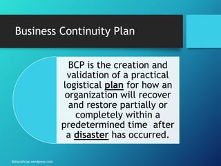 The document outlines the processes and strategies involved in business continuity planning (BCP) and disaster recovery planning (DRP), emphasizing the importance of having a practical plan to restore operations following a disaster. It details the lifecycle of BCP/DRP, including risk assessment, recovery strategies, types of plans, and the significance of regular testing and updates. Additionally, it discusses the various types of backup options and alternative processing facilities that organizations can utilize to ensure operational resilience.