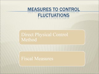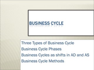 The document discusses the business cycle, which encompasses the fluctuations in national output, income, and employment that typically last between 2 to 10 years. It defines three types of business cycles: short-term, medium-term, and long-term, and outlines the four major phases of the business cycle: recession, trough, expansion, and peak. Additionally, it touches on government roles in the economy through public distribution systems, taxation, and expenditure.