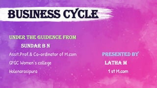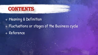 The business cycle is defined as the fluctuations in gross domestic product (GDP) around its long-term growth rate, encompassing stages of expansion, peak, contraction, trough, and recovery. Each stage represents different economic indicators and activities, where expansion shows growth and peak marks saturation, followed by recession and depression characterized by declining economic performance. Recovery initiates a turnaround, leading to renewed economic activity as demand and production begin to increase.