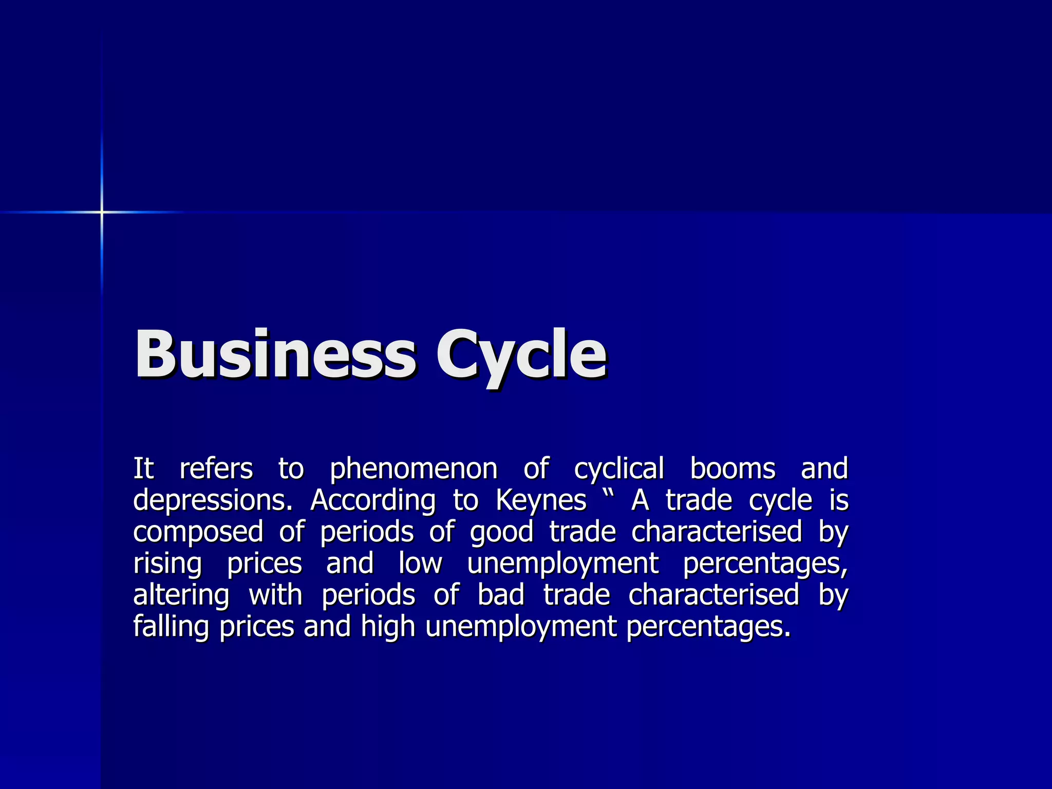 1. Keynes defined business cycles as periods of good trade characterized by rising prices and low unemployment alternating with periods of bad trade with falling prices and high unemployment.