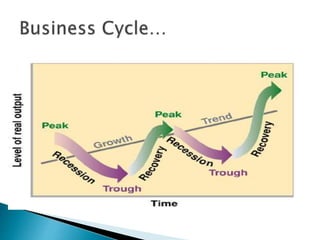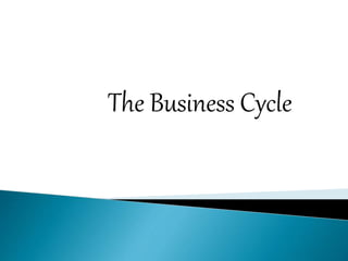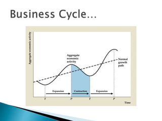 The document discusses the business cycle, which includes phases of expansion, recession, depression, and recovery, characterized by fluctuations in economic activity. It outlines the key features of each phase, the factors that influence these cycles, and theories explaining their causes, such as the Keynesian theory and the politically based business cycle. It emphasizes the importance of government intervention to stabilize the economy and mitigate the negative impacts of business cycles on unemployment and poverty.