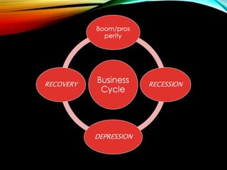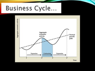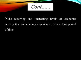 The business cycle refers to periodic fluctuations in economic activity, involving periods of expansion and contraction. A peak marks the end of an expansion period, while a trough marks the end of a contraction period. Business cycles are caused by internal factors like consumption, investment, and government activity, as well as external factors like innovations, wars, and political events. Governments try to control business cycles through monetary and fiscal policies that influence aggregate demand and output.