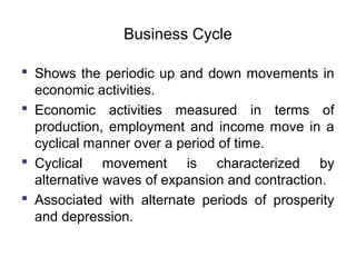 Business cycles show periodic fluctuations in economic activity, measured by indicators like production, employment, and income. There are four phases of a business cycle: expansion, peak, contraction/recession, and trough. Expansions involve growth while contractions involve declines. Business cycles are caused by factors like changes in investment levels, consumer and business expectations, and technological innovations. Theories like Keynes' emphasize how fluctuations in investment can drive cycles, while real business cycle theory sees cycles arising from supply-side shocks. Cycles affect the economy through impacts on areas like growth, inflation, and unemployment. Policy tools can help control the amplitude of cycles.