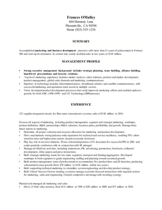 Frances O'Malley is an accomplished marketing and business development executive with over 15 years of experience in Fortune 500 and start-up environments. She has nearly doubled sales to $130 million in her current role at 123 Technology and has a proven track record of developing marketing strategies that enable explosive growth for companies.