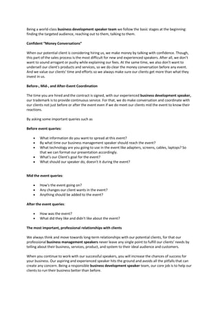 As expert business development speakers, focusing on connecting with the audience, preparing the right length speech, and being able to answer questions is key. The team at WCD Enterprises helps businesses at every stage by dedicating themselves to the target audience, having service-focused sales conversations, discussing fees confidently, and coordinating extensively before, during, and after events to ensure clients' needs are met and long-term professional relationships are built. Hiring their business development speakers will effectively spread information about a company's products, services, and systems to potential customers.