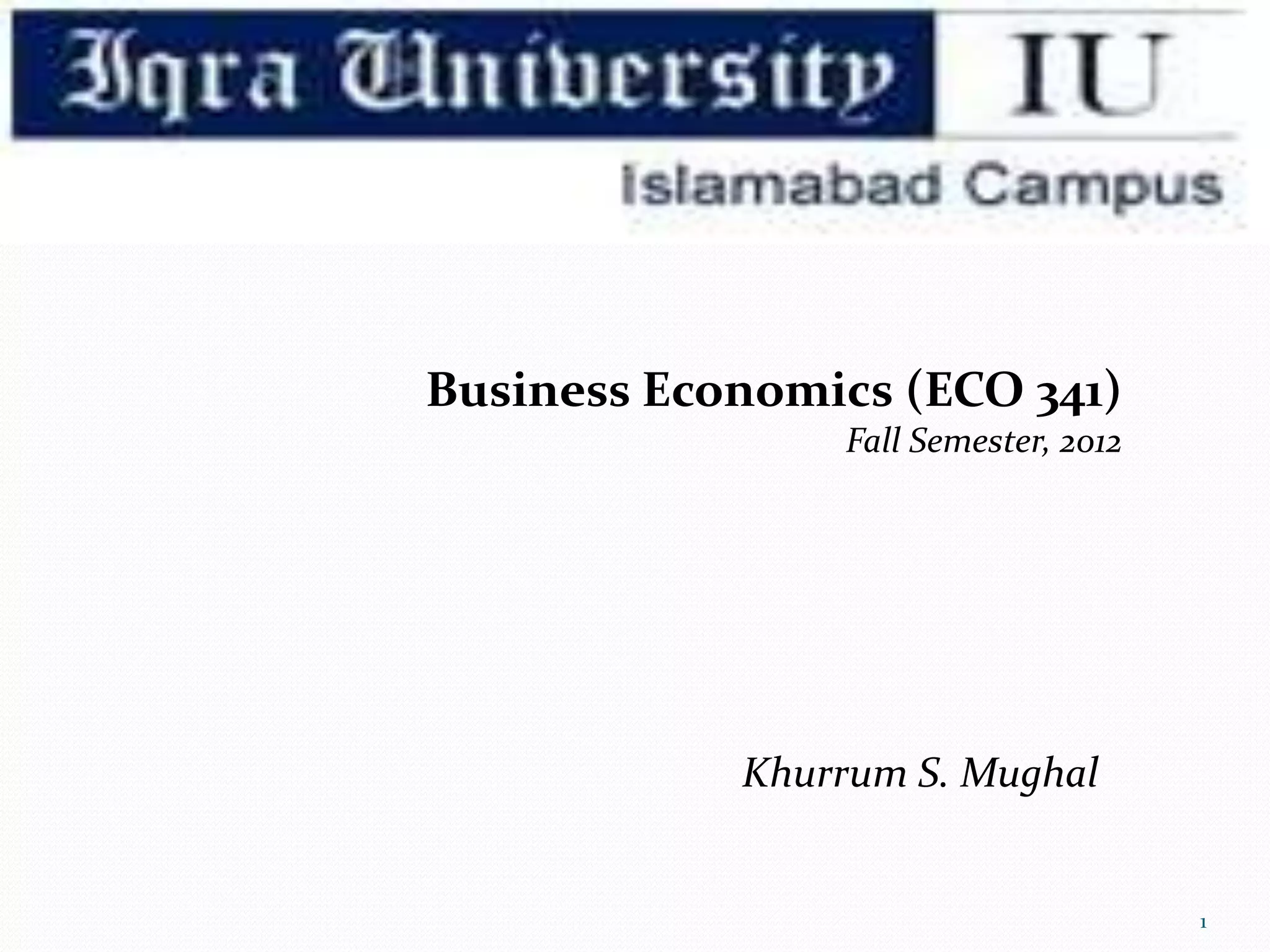 This document outlines the syllabus for a Business Economics course. It includes required texts, grading criteria, and an overview of key economic concepts to be covered throughout the semester. Specifically, it will cover microeconomics and macroeconomics topics, including scarcity, production possibility frontiers, demand and supply analysis, and the role of economics in managerial decision making. Students will be evaluated based on class participation, assignments, presentations, exams and a final exam.