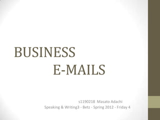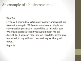 The document discusses the importance of learning to write business emails. It provides an example of a basic business email format. It explains that business emails are necessary tools for connecting with others in a professional context and are used for communications like requests, reports, orders, and more. The document advises improving email writing skills by having a teacher review draft emails, researching best practices online, examining real-world examples, and getting feedback from friends through practice. It concludes that business emails are very important for work and recommends studying the topic diligently, including writing many sample emails to gain experience with different types of professional communications.