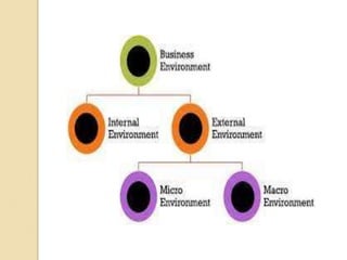 This document provides an overview of business environment and its key components. It defines business environment as the external factors that influence a business and are outside its control. These include economic, social, technological, political, and legal environments. The business environment presents both opportunities and threats. Understanding the business environment is important for businesses to survive, grow, and adapt to changes. The document outlines the specific factors within each component of the business environment and how they can impact businesses.
