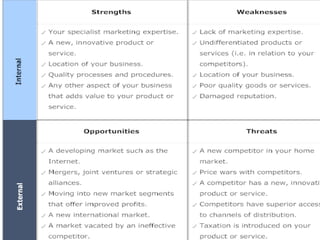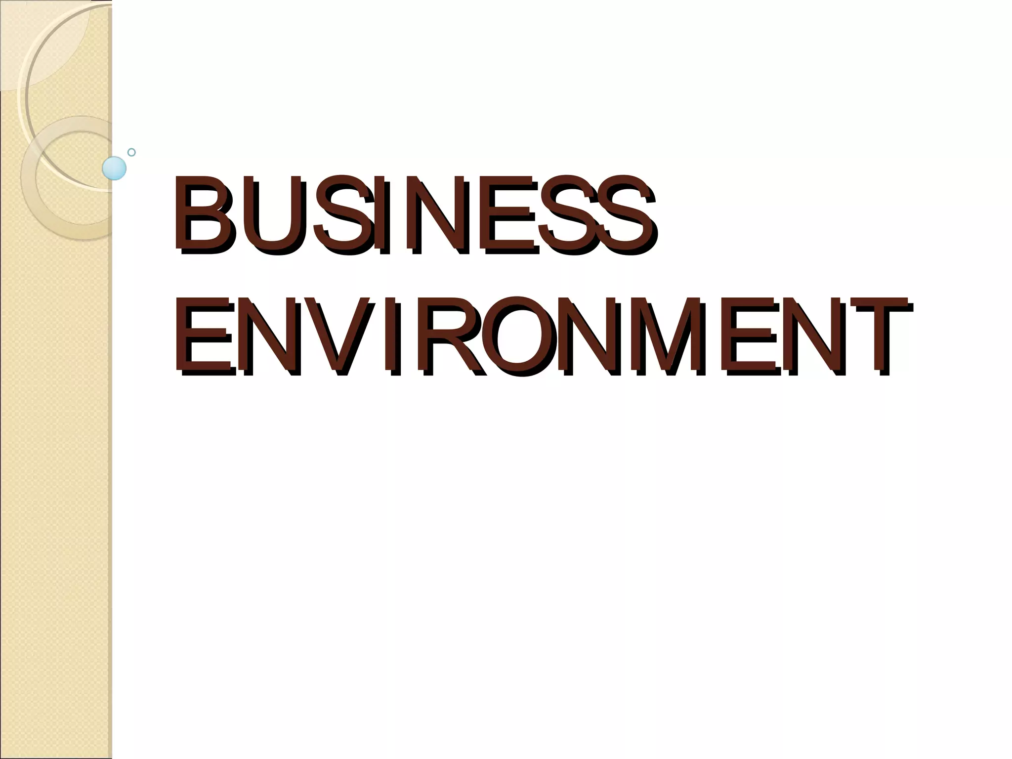 The document provides an overview of the business environment and factors that influence business decisions. It discusses the internal and external environment. The internal environment includes factors like management structure, resources, and company culture. The external environment includes the micro environment of suppliers, customers, and competitors. It also includes the macro environment such as economic, political, social, and technological factors. A SWOT analysis is used to evaluate the strengths, weaknesses, opportunities, and threats. Porter's five forces model is also discussed as a framework for analyzing industry competition.
