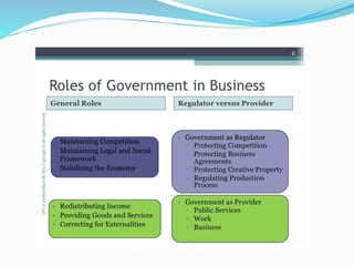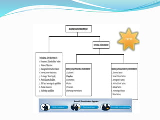 2. It discusses different types of business organizations like sole proprietorships, partnerships, and corporations.