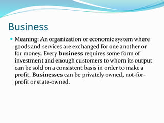 1. It defines business as an organization engaged in commercial activities like production, services, or retail for earning a livelihood.