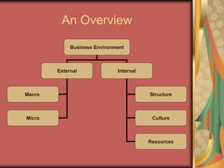 The document provides an overview of analyzing a business's external and internal environment. It discusses the macro environment including political, economic, social, technological, and legal factors. It also discusses the micro environment including customers, competitors, suppliers, and other stakeholders. It introduces Porter's five forces model for analyzing industry competition. Additionally, it covers analyzing a business's internal structure, culture, and resources. Key frameworks discussed for environmental analysis include PESTEL/PESTLE, ETOP, and SWOT. The purpose is to understand all relevant external and internal factors that could impact a business.
