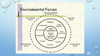 The document discusses the different types of business environments that can impact an organization. It defines the business environment as consisting of all internal and external factors that influence a business's operations. The internal environment includes factors like organizational culture that a business can control. The external environment contains uncontrollable factors like the economic conditions, competitors, and government policies in the macro environment. It also examines the micro environment surrounding the business, including customers, suppliers, and other stakeholders that directly affect operations.