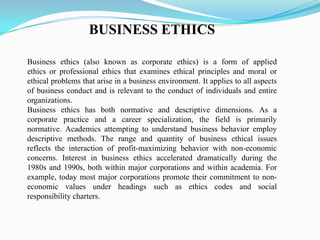 The document provides an overview of business ethics. It discusses how business ethics examines ethical principles and problems that arise in a business environment. It applies to all aspects of business conduct for both individuals and entire organizations. The document also summarizes several key aspects of business ethics including defining morality and ethics, the history of business ethics, how an individual's ethics are formed, functional business areas like finance and human resources, implementing ethics programs, the role of ethics officers, codes of ethics, objectives of codes of ethics, the relationship between ethics and law, principles of social and ethical accounting, and conclusions.