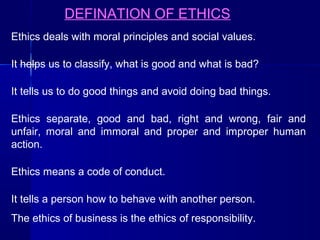 Business ethics deals with establishing moral principles and values to guide business decisions and actions. It helps classify behaviors as good or bad, right or wrong, and fair or unfair. Organizations that support ethics initiatives show more productivity and employee retention than those that only focus on legal compliance. When a business operates ethically, it garners respect from within and outside the company. Employees are also more likely to stay at companies that promote ethical conduct. Consumers demonstrate loyalty to companies that exhibit strong corporate responsibility. The purpose of a business ethics code is to outline acceptable and unacceptable behaviors to regulate conduct where profit is the primary motive. Business ethics are important for companies' long-term survival and reputation.