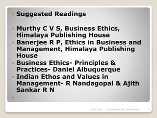 This document provides an overview of key topics in business ethics based on syllabus material from a prescribed business ethics textbook. It discusses the meaning and importance of business ethics, factors that influence business ethics like leadership and corporate culture, different types of ethics like transactional and participatory ethics. It also summarizes key sections from the textbook syllabus on values, norms, beliefs and moral standards; the need for business ethics; and compares the ethics of business competition to competition in sports.