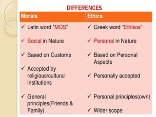 This document provides an introduction to business ethics. It defines ethics as a set of moral standards or values to determine what is right or wrong. Business ethics applies ethical standards to business decisions and actions. There are two types of ethical problems in business - overt issues like bribery and theft, and more complex covert issues. The document outlines three models of management ethics and six stages of ethical consciousness that businesses may progress through. It also discusses factors like an individual manager's moral development and a company's culture and systems that can influence ethical choices. The benefits of practicing business ethics and approaches to ethical decision making are presented.