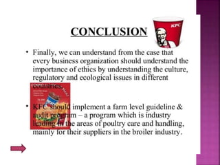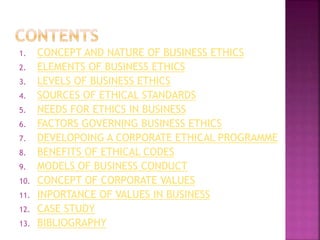This document outlines the key topics around business ethics that will be covered, including: the concept and nature of business ethics; elements of business ethics like values, rights, and duties; levels of business ethics from societal to personal; sources of ethical standards like societal attitudes and legal environments; the need for ethics in business to maintain image and trust; factors governing business ethics like organizational goals and professional codes; developing an ethical program with codes, communication, and enforcement; models of business conduct; the concept and importance of corporate values; and a case study with bibliography. The presentation will cover these various aspects of business ethics.