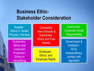 Dokumen tersebut membahas tentang tanggung jawab sosial perusahaan (CSR) yang mencakup empat aspek utama yaitu tanggung jawab ekonomi, hukum, etika, dan filantropi serta manfaat pelaksanaan CSR bagi perusahaan dan masyarakat."