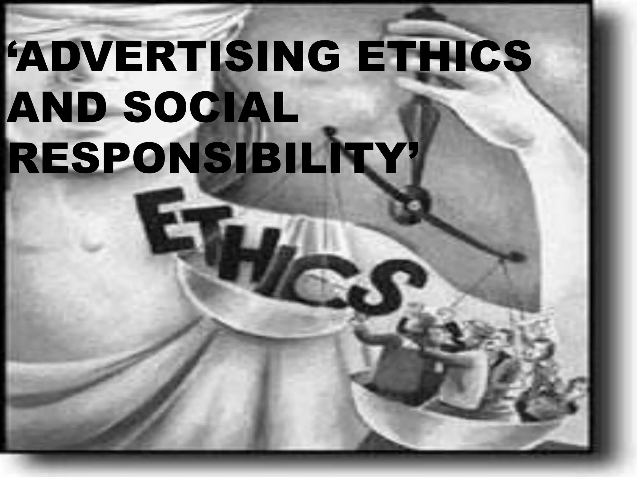 This document discusses advertising ethics and social responsibility. It begins with definitions of advertising and objectives. It then discusses influences on ethical behavior in advertising such as family, experiences and peer groups. It also outlines some common advertising strategies and features of advertising ethics. The document provides a framework for analyzing advertising ethics and discusses the purpose and benefits of advertising. It concludes with sections on ethical and moral principles, social responsibility and responsibility in advertising, and provides a bibliography.