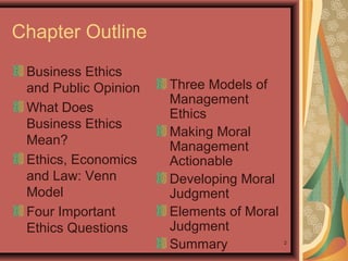 This document outlines key concepts in business ethics. It discusses how public interest in business ethics has increased in recent decades due to media coverage of ethical issues. It also examines definitions of business ethics and the relationship between ethics, economics, and law. Additionally, it presents three models of management ethics - immoral, moral, and amoral - and explores how to develop moral judgment and actionable moral management.