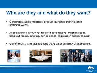 This document provides information and tips for finding clients for event and function management. It suggests targeting corporates, associations, and government for meetings, conferences, and other events. It lists websites and organizations to find potential clients and event details. It also recommends personally contacting decision makers, hosting familiarization events, and collaborating with local partners. The document advises attending industry expos and conventions to meet suppliers and gather ideas. It stresses keeping an up-to-date online presence through a website and e-newsletters to promote event space and services.