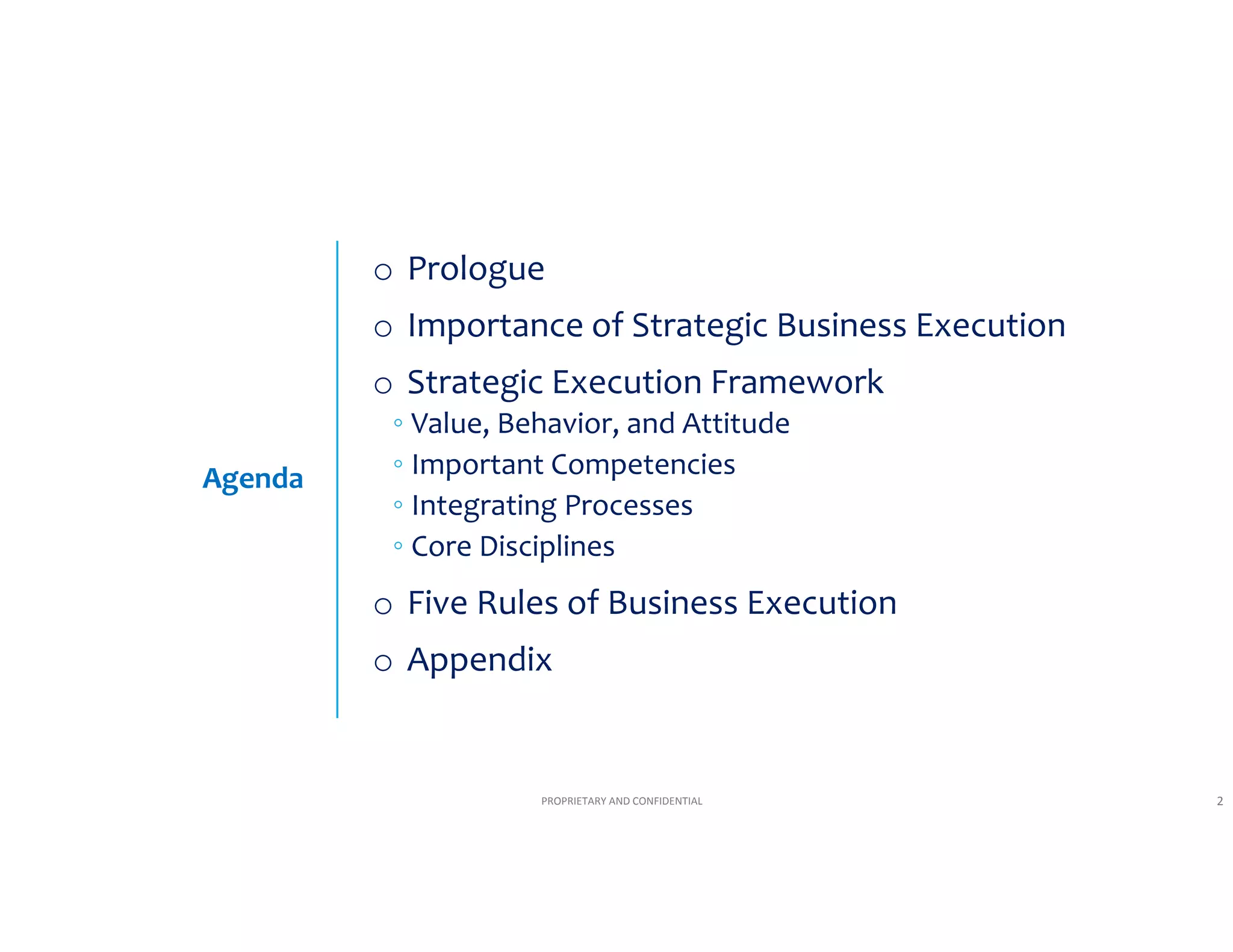 The document provides an introduction to strategic business execution. It discusses the importance of strategic execution, as 90% of strategies fail due to poor execution. It then presents a strategic execution framework with four components: values/behaviors/attitudes, important competencies, core disciplines, and integrating processes. The document delves into each of these components, describing key aspects of strategic business execution like strategic planning, portfolio management, program management and more.