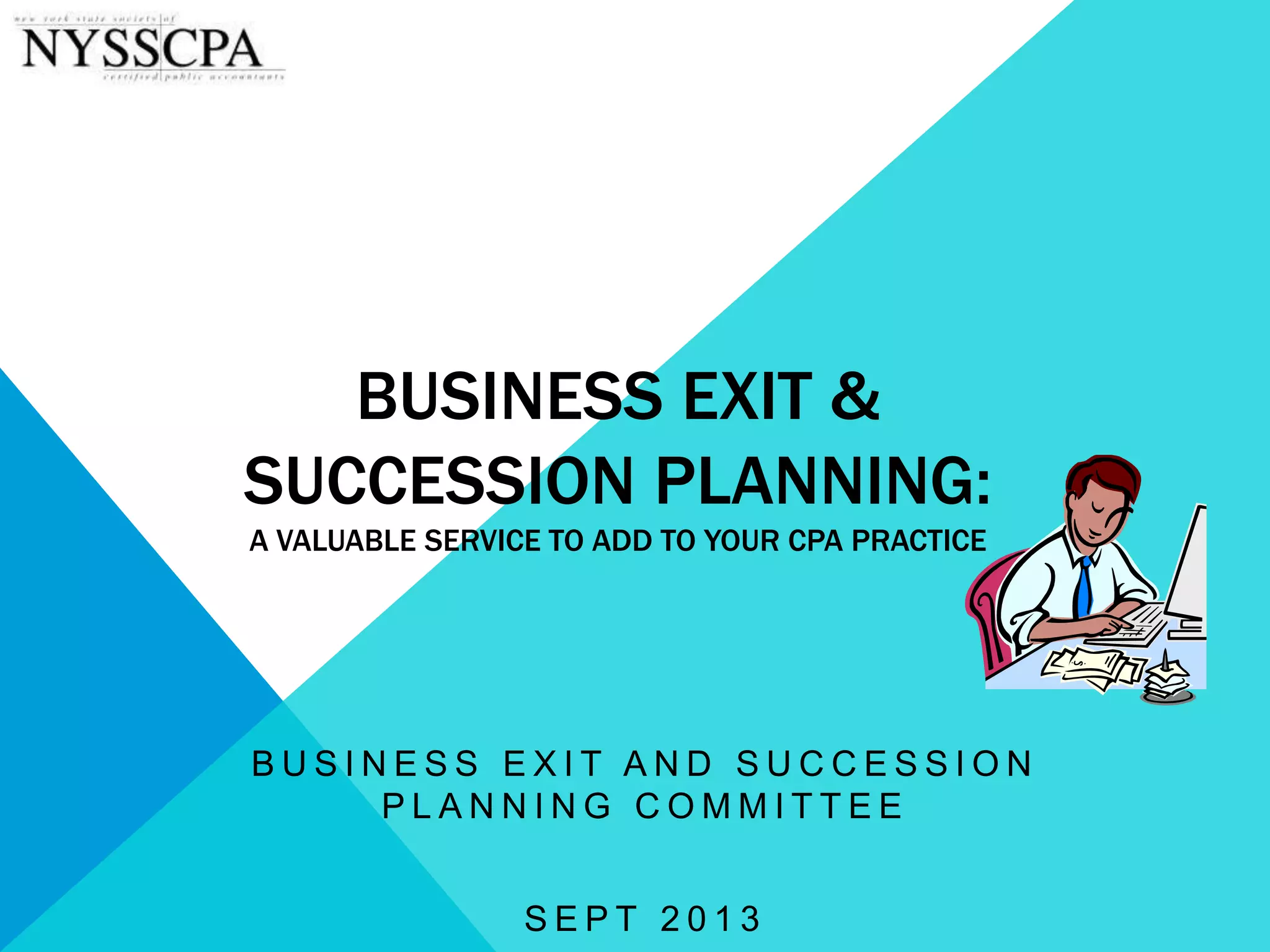 This document discusses succession planning, estate planning, and exit planning for business owners. It outlines the key differences between these processes. Succession planning focuses on transferring leadership from current to future management to ensure the ongoing viability of the company. Estate planning aims to transfer ownership from current to future shareholders. Exit planning involves determining the owner's plan to leave the business, usually transferring both ownership and management responsibilities. The document emphasizes that succession and exit planning are critical given statistics on family business survival rates and the fact that many owners lack formal plans. It provides overviews of the key steps in succession and exit planning processes to help owners successfully transfer their companies. The role of CPAs is highlighted as they are well-positioned to coordinate the