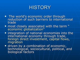 Globalization refers to the integration of economies around the world through reduced barriers to trade and financial flows. It is driven by technological advances as well as economic, social, and political factors. Globalization can be measured across economic, social, and political dimensions. The most globalized countries according to research groups are Western European nations like Austria and the UK, while the least globalized are countries in Africa and Asia such as Haiti, Myanmar, and Burundi. Globalization has increased international trade dramatically and led to a more interconnected global financial system, with both benefits and challenges for national economies.