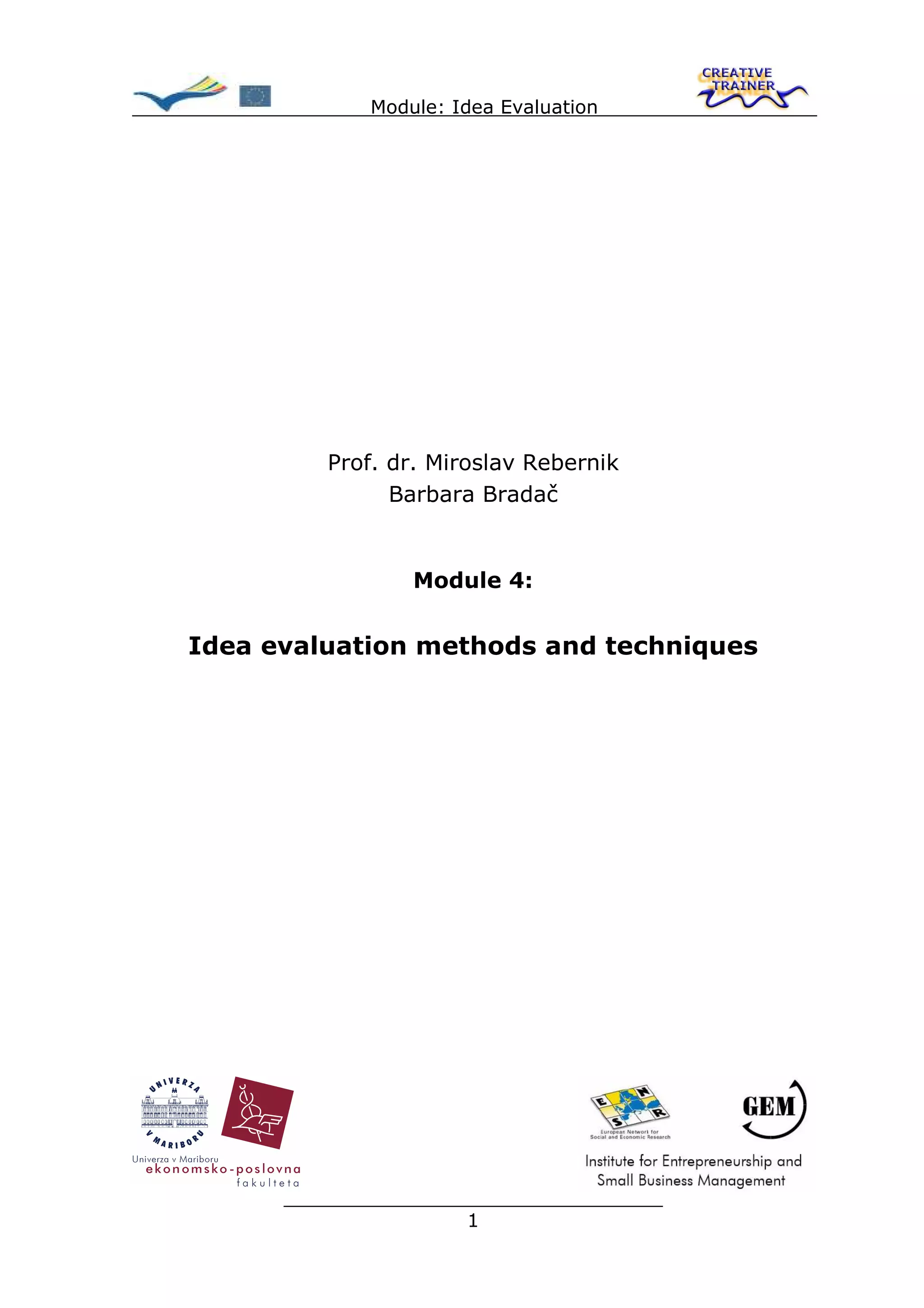 The document provides an overview of idea evaluation methods and techniques. It discusses the need for a holistic approach to idea evaluation that considers the entire process from idea generation through implementation. The document then describes the typical stages in managing ideas, from identifying ideas to selecting and implementing them. Finally, it outlines 29 specific evaluation methods, providing brief descriptions of each method's purpose and use. The goal is to present idea evaluation tools and techniques that are relatively easy to use, especially for small- and medium-sized companies.