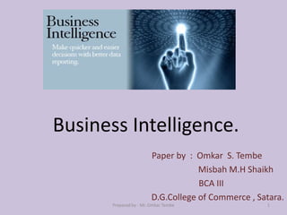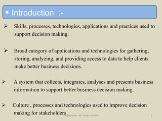 The document discusses business intelligence (BI), detailing its definition, evolution, and life cycle, along with tools and processes used for effective decision-making in organizations. It highlights practical examples of BI applications across various sectors, emphasizing the importance of data analysis, forecasting, and the implementation of BI tools. Additionally, it outlines the advantages of BI, such as improved decision-making and increased efficiency.