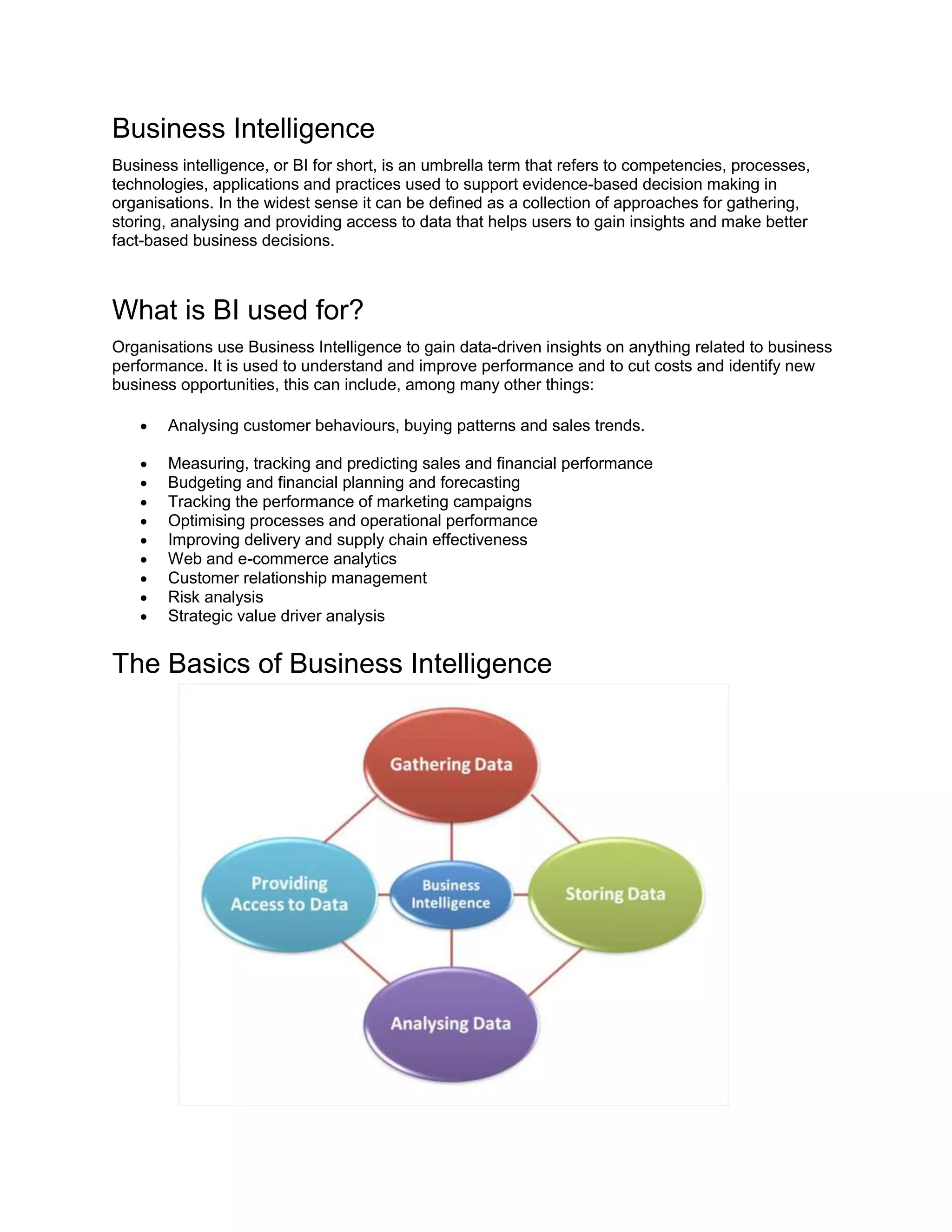 Business intelligence (BI) refers to processes, technologies and applications used to support data-driven decision making in organizations. Organizations use BI to gain insights into business performance, customers, sales, finances and more. The basic components of BI are gathering data, storing it, analyzing it, and providing access to insights. Leading companies use BI effectively by linking data analysis to strategic objectives, collecting the right types of data, testing assumptions through experiments, communicating insights clearly, and turning insights into actions and decisions.