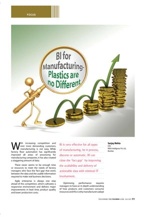 The document discusses the significance of Business Intelligence (BI) in the manufacturing sector, highlighting its role in enhancing operational efficiency, reducing production costs, and improving customer satisfaction. BI systems provide actionable data that help managers make informed decisions regarding production, inventory management, and responsiveness to market demands. By leveraging data analytics, manufacturers can optimize processes, increase product quality, and maintain competitiveness in a rapidly changing environment.