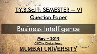 This document contains a question paper for the B.Sc.IT Semester VI business intelligence course from May 2019, outlining various topics and questions across five sections. Each section requires students to attempt three questions from a variety of subjects, including business intelligence systems, decision support systems, data mining, and knowledge management. Additionally, it promotes the availability of video solutions and encourages subscriptions for updates.